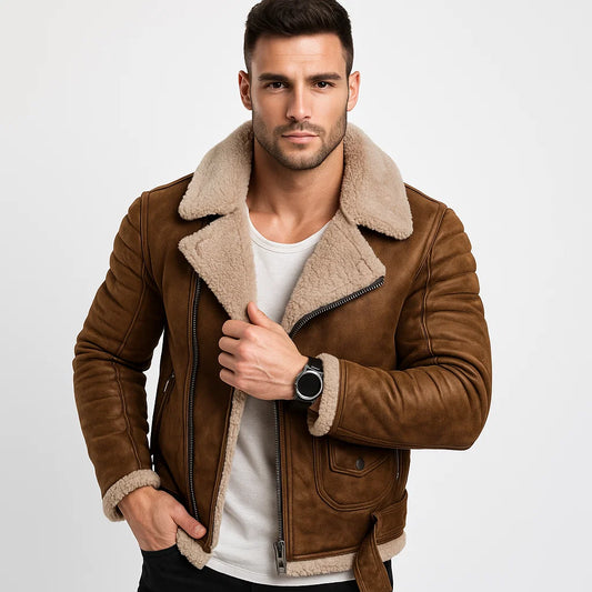 Men’s Fashion Leather Jacket Shearling Collar Streetwear